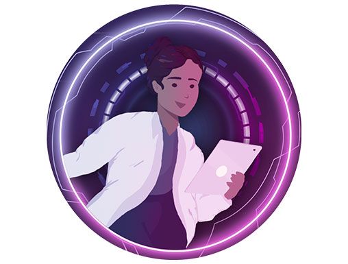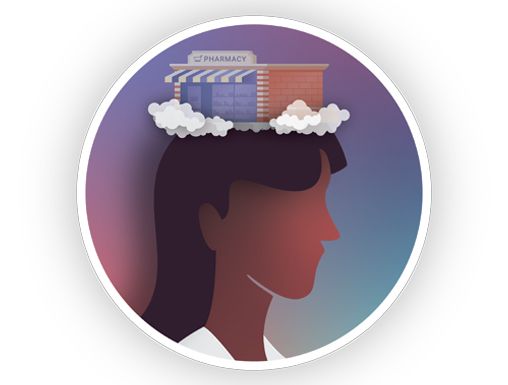 Circular shape with a silhouette of a woman's head with pharmacy icons